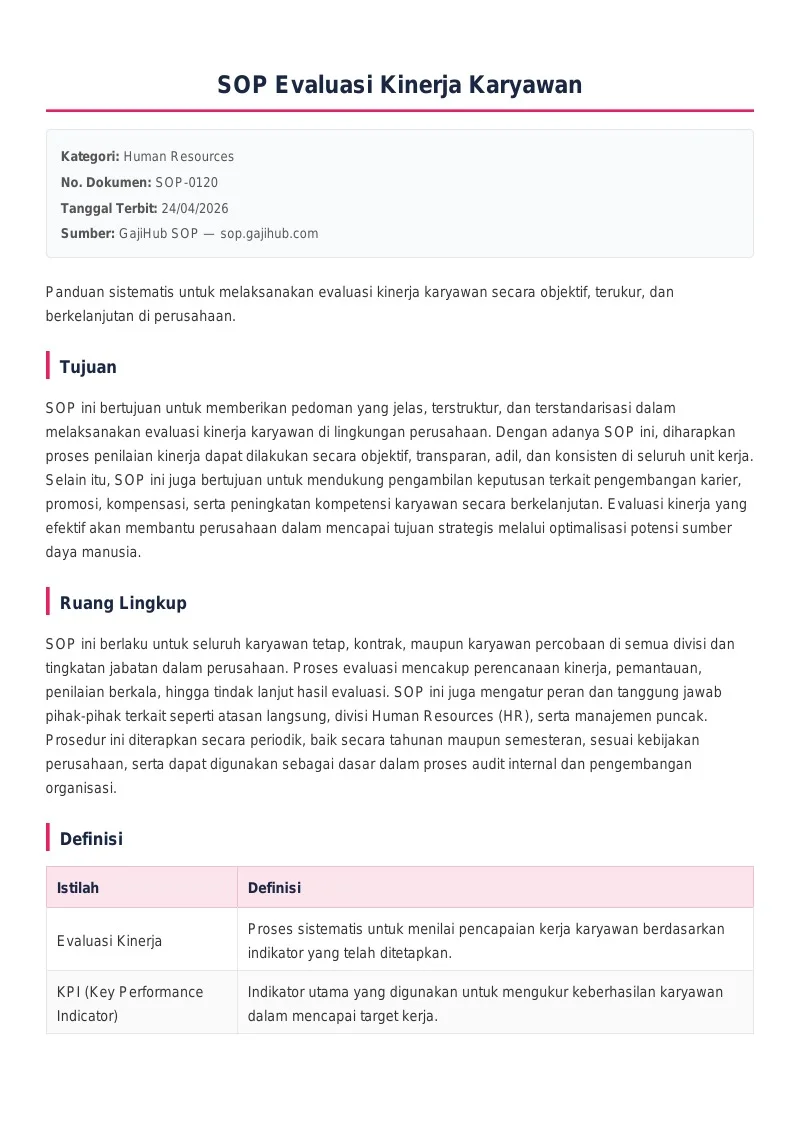 | Divisi HR | Menyusun kebijakan evaluasi kinerja, menyediakan alat ukur, memfasilitasi proses penilaian, serta melakukan monitoring dan evaluasi pelaksanaan SOP. |