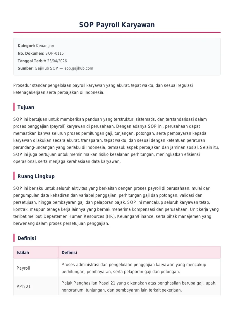 SOP ini bertujuan untuk memberikan panduan yang terstruktur, sistematis, dan terstandarisasi dalam proses penggajian (payroll) karyawan di perusahaan. Dengan adanya SOP ini, perusahaan dapat memastikan bahwa seluruh proses perhitungan gaji, tunjangan, potongan, serta pembayaran kepada karyawan dilakukan secara akurat, transparan, tepat waktu, dan sesuai dengan ketentuan peraturan perundang-undangan yang berlaku di Indonesia, termasuk aspek perpajakan dan jaminan sosial. Selain itu, SOP ini juga bertujuan untuk meminimalkan risiko kesalahan perhitungan, meningkatkan efisiensi operasional, serta menjaga kerahasiaan data karyawan.