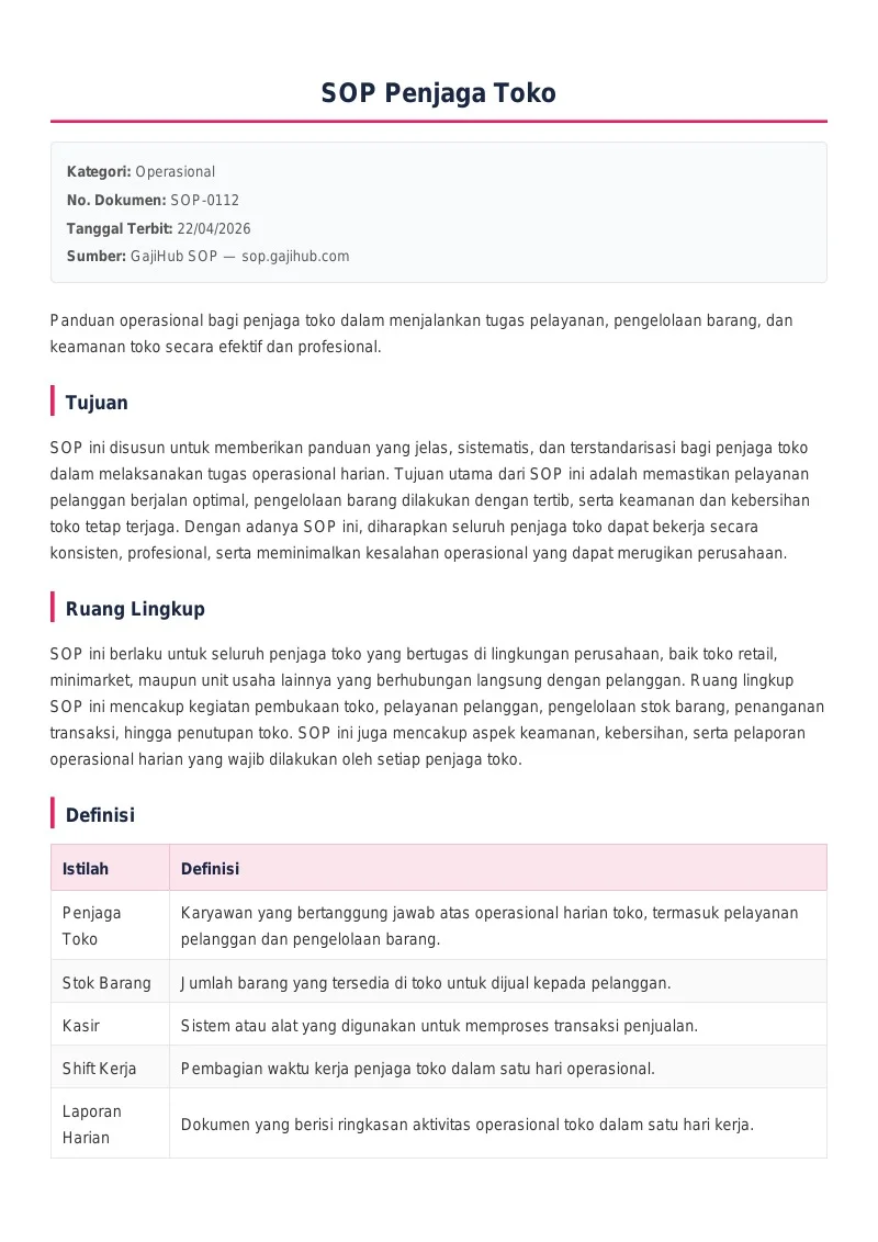 SOP ini disusun untuk memberikan panduan yang jelas, sistematis, dan terstandarisasi bagi penjaga toko dalam melaksanakan tugas operasional harian. Tujuan utama dari SOP ini adalah memastikan pelayanan pelanggan berjalan optimal, pengelolaan barang dilakukan dengan tertib, serta keamanan dan kebersihan toko tetap terjaga. Dengan adanya SOP ini, diharapkan seluruh penjaga toko dapat bekerja secara konsisten, profesional, serta meminimalkan kesalahan operasional yang dapat merugikan perusahaan.