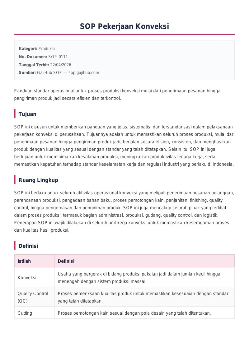 SOP ini berlaku untuk seluruh aktivitas operasional konveksi yang meliputi penerimaan pesanan pelanggan, perencanaan produksi, pengadaan bahan baku, proses pemotongan kain, penjahitan, finishing, quality control, hingga pengemasan dan pengiriman produk. SOP ini juga mencakup seluruh pihak yang terlibat dalam proses produksi, termasuk bagian administrasi, produksi, gudang, quality control, dan logistik. Penerapan SOP ini wajib dilakukan di seluruh unit kerja konveksi untuk memastikan keseragaman proses dan kualitas hasil produksi.