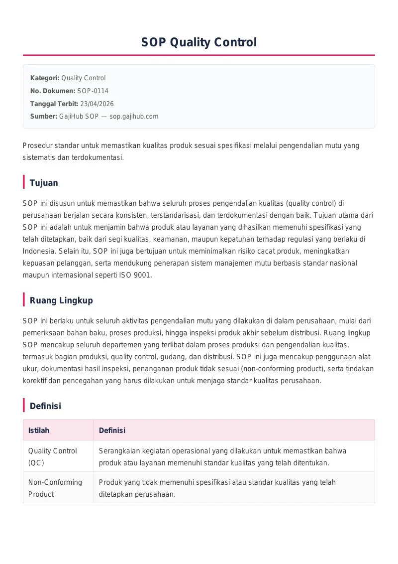SOP ini disusun untuk memastikan bahwa seluruh proses pengendalian kualitas (quality control) di perusahaan berjalan secara konsisten, terstandarisasi, dan terdokumentasi dengan baik. Tujuan utama dari SOP ini adalah untuk menjamin bahwa produk atau layanan yang dihasilkan memenuhi spesifikasi yang telah ditetapkan, baik dari segi kualitas, keamanan, maupun kepatuhan terhadap regulasi yang berlaku di Indonesia. Selain itu, SOP ini juga bertujuan untuk meminimalkan risiko cacat produk, meningkatkan kepuasan pelanggan, serta mendukung penerapan sistem manajemen mutu berbasis standar nasional maupun internasional seperti ISO 9001.